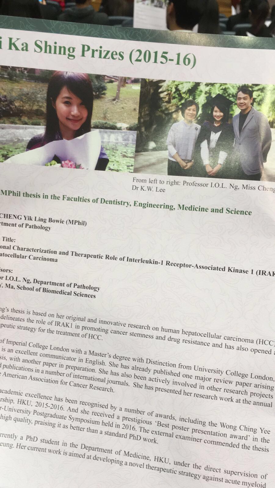 Terence’s MPhil student, Bowie CHENG Yik Ling received the Li Ka Shing Prize for the Best MPhil Thesis (2015/16) at HKU. This Prize is awarded to only 1 MPhil graduate in the Faculties of Dentistry, Engineering, Medicine and Science each year. Well done and all the best to your PhD studies ahead!