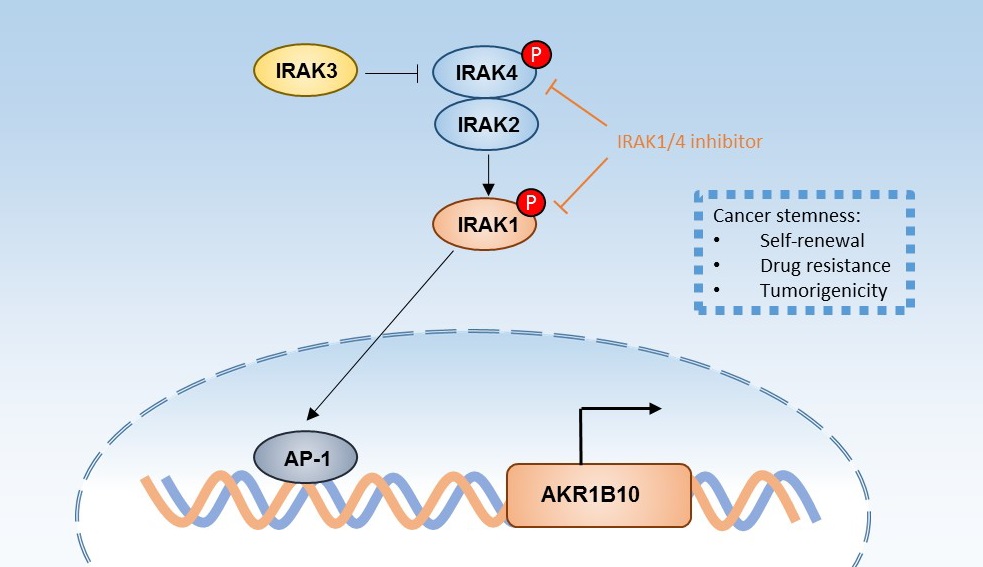 Cheng BY#, Lau EY#, Leung DH#, Ho NP, Cheng LK, Lin CH, Lo RC, Ma S, Ng IO, Lee TK. IRAK1 augments cancer stemness and drug resistance via the AP-1/AKR1B10 signaling cascade in hepatocellular carcinoma. Cancer Res 2018; 78(9):2332-42.