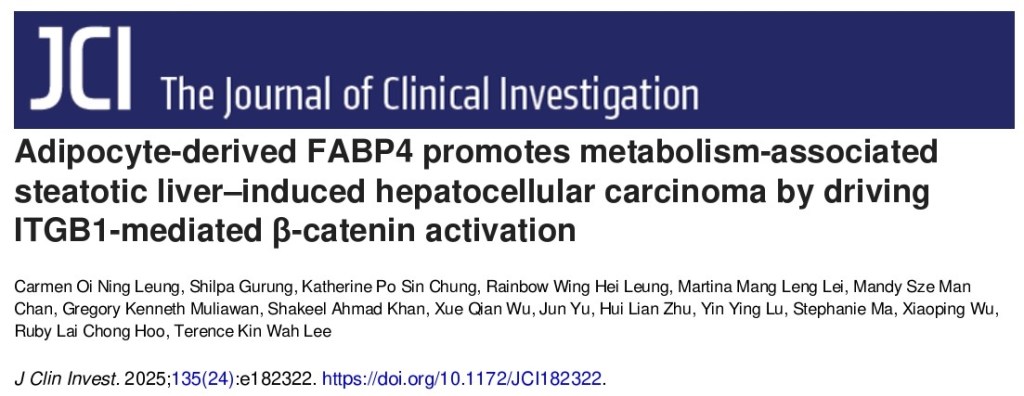 This work has finally been completed after seven years of dedication.. Congratulations to Carmen, Shilpa, Katherine and the team for the publication entitled “Adipocyte-derived FABP4 promotes metabolism-associated steatotic liver–induced hepatocellular carcinoma by driving ITGB1-mediated β-catenin activation,” in Journal of Clinical Investigation. Link to paper